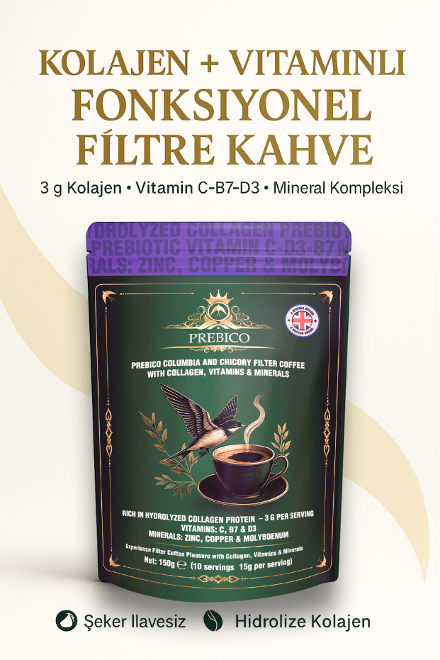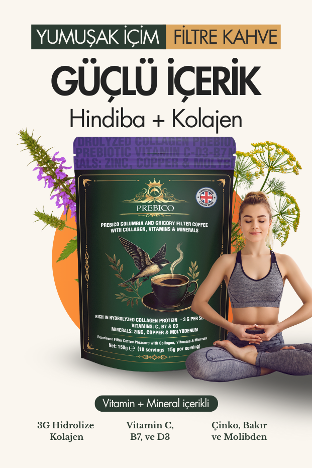 Prebico Kolombiya ve Hindiba filtre kahvesi; Kolombiya çekirdek kahvesi, hindiba kökü, tip 1 & tip 3 kolajen (2.500 mg), hyaluronik asit, inülin prebiyotik lif, vitamin ve mineraller ile zenginleştirilmiştir.