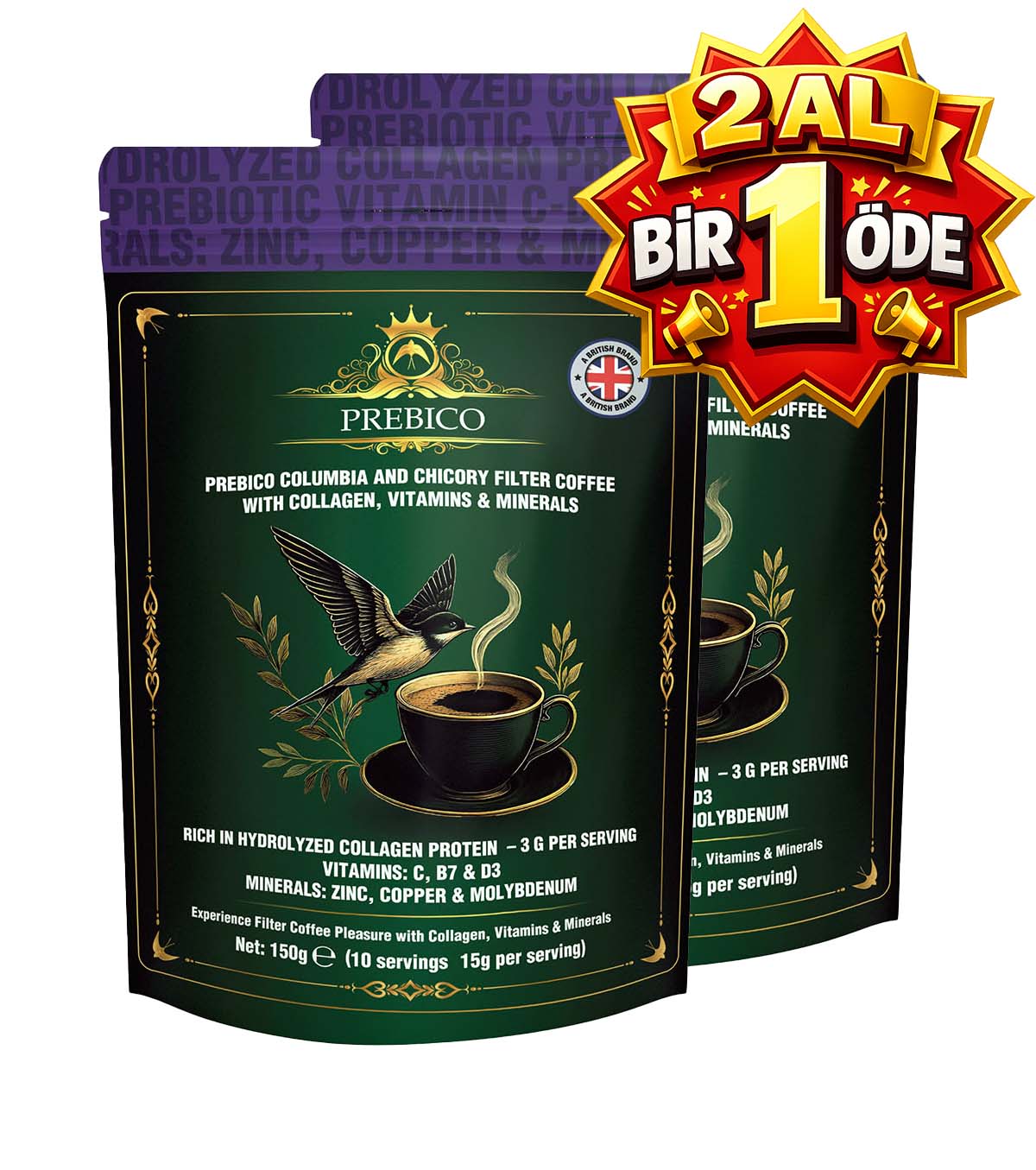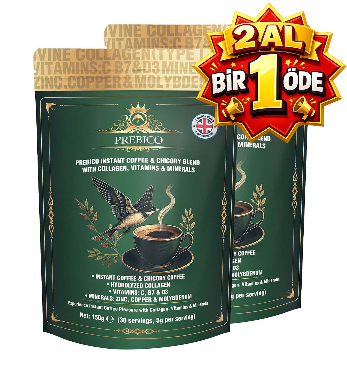 2 x Prebico Kolombiya ve Hindiba (Chicory) Instant Hazır kahve — kolajen, vitamin ve mineraller ile zenginleştirilmiş.
